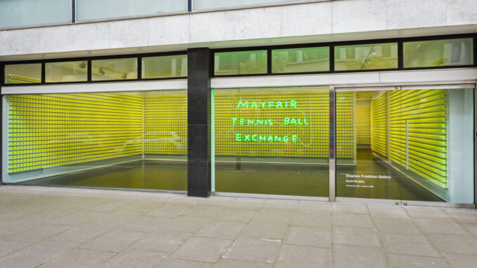 Stephen Friedman Gallery , 2021Interactive Installation. Visitors are invited to bring an old ball to swap with a new one from the numerous shelves that line the walls. Gradually the rows of yellow spheres are replaced with misshapen and discoloured forms that represent the joy of trade.